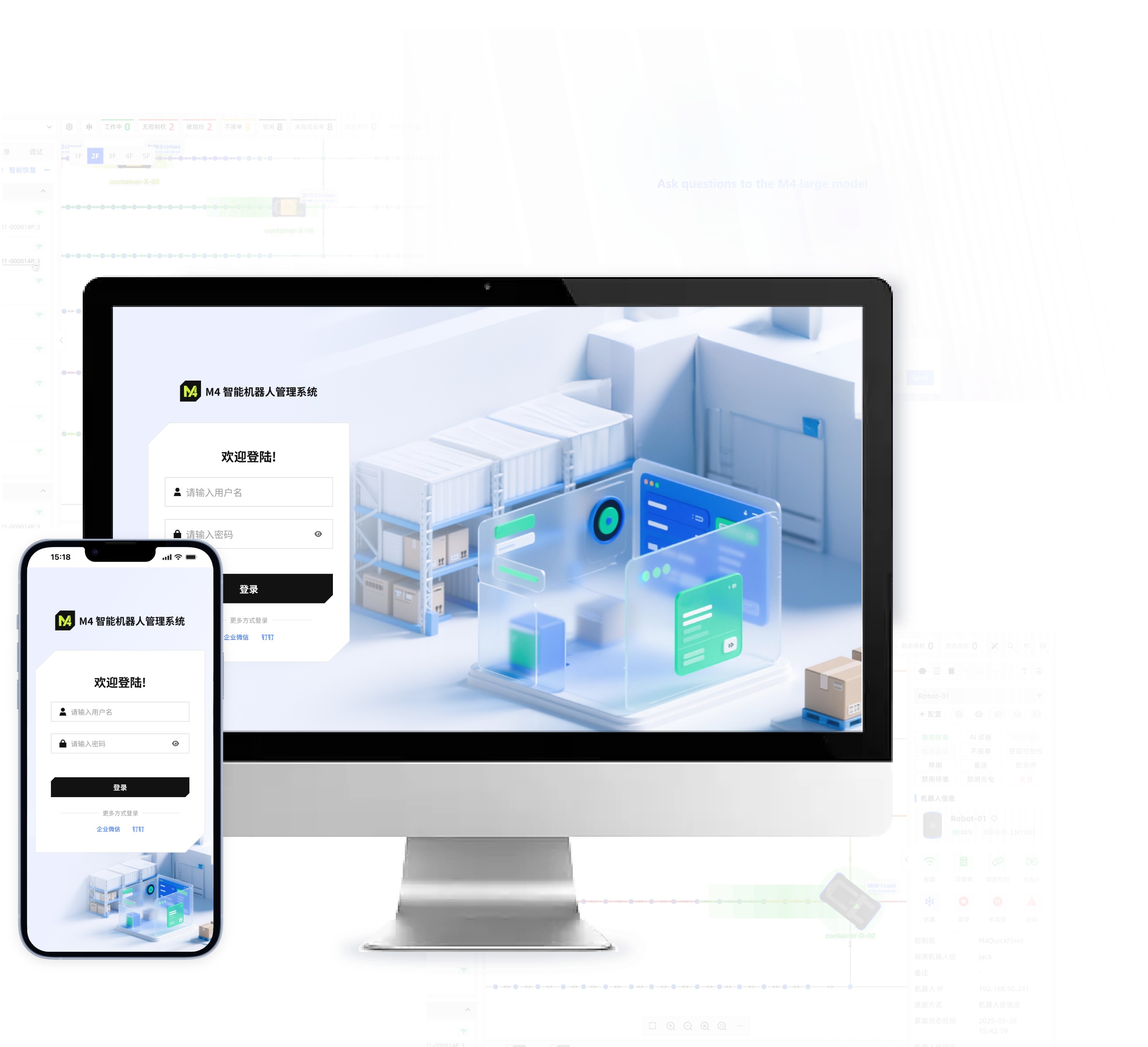 M4 is an intelligent robot management system launched by SEER. Based on cutting-edge development technologies, robot planning and control algorithms, and AI LLM, M4 features a modern, friendly, and easy-to-use interface, with full mobile support.