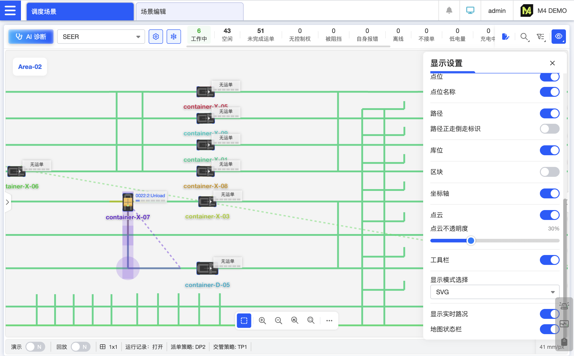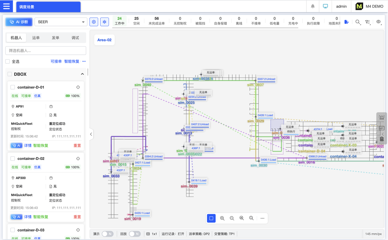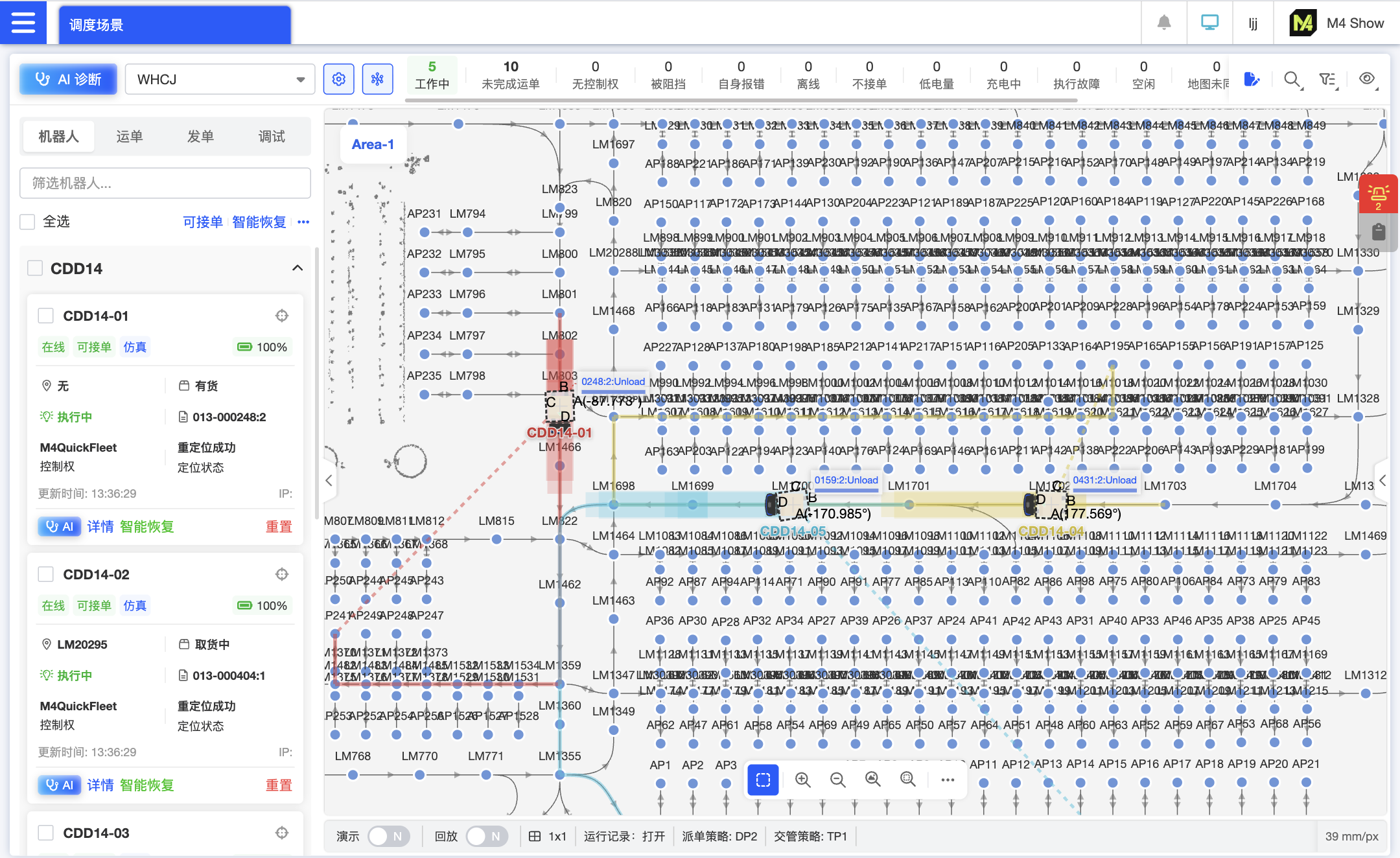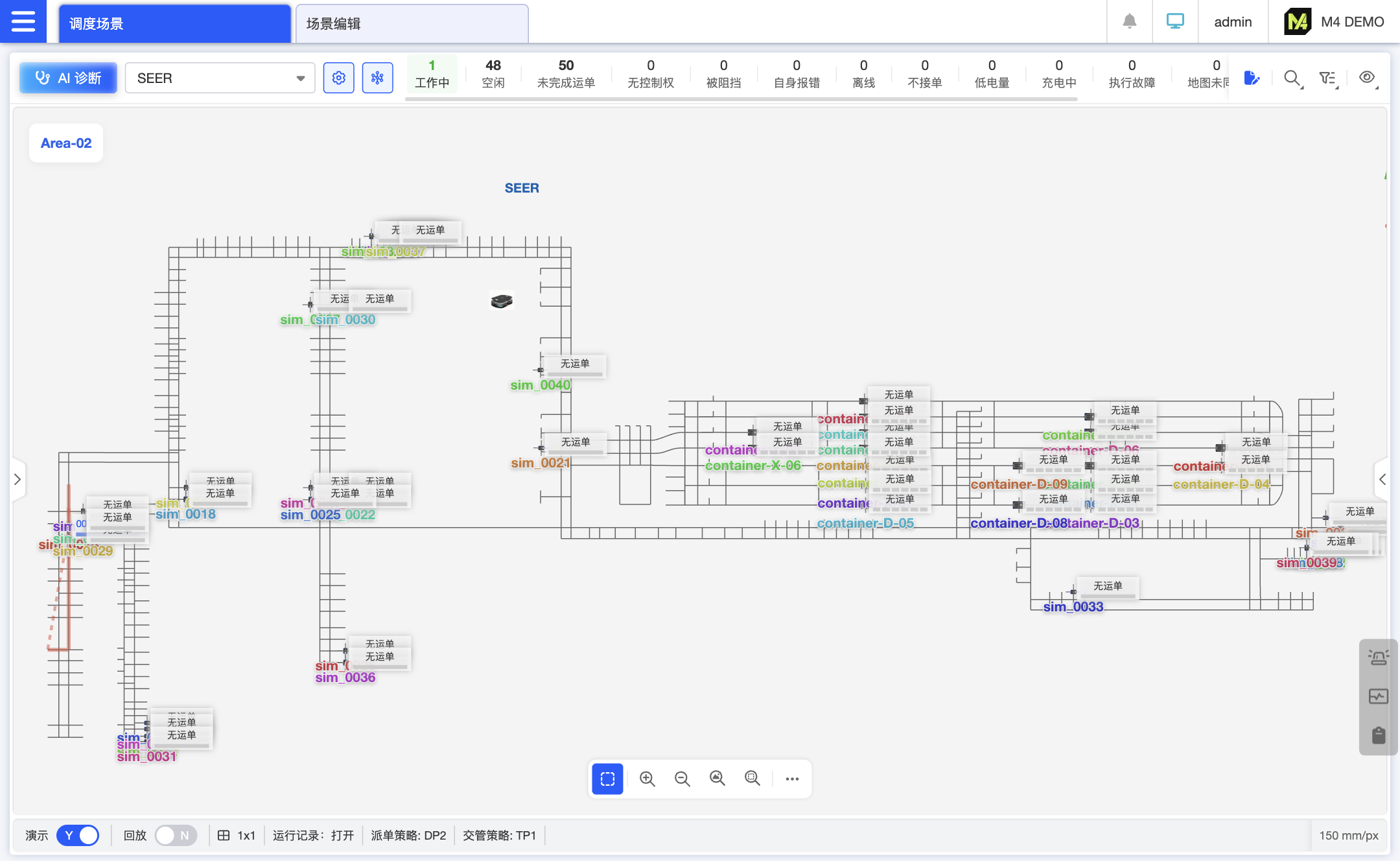 调度总体运行界面:顶部为场景切换下拉框和机器人、场景状态统计栏;左侧机器人卡片纵向排列,直观查看机器人关键信息;中间的地图区域显示场景整体的分布、机器人实时位置、任务执行路径及区域;底部状态栏呈现调度核心参数。全局掌握整体调度状态。