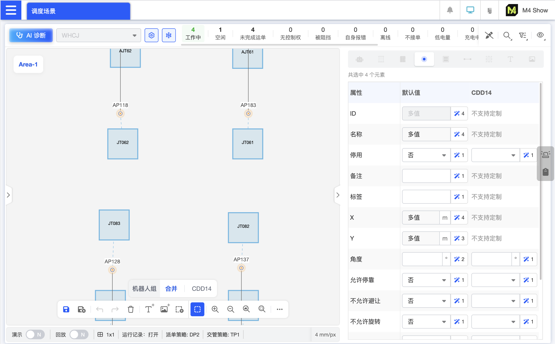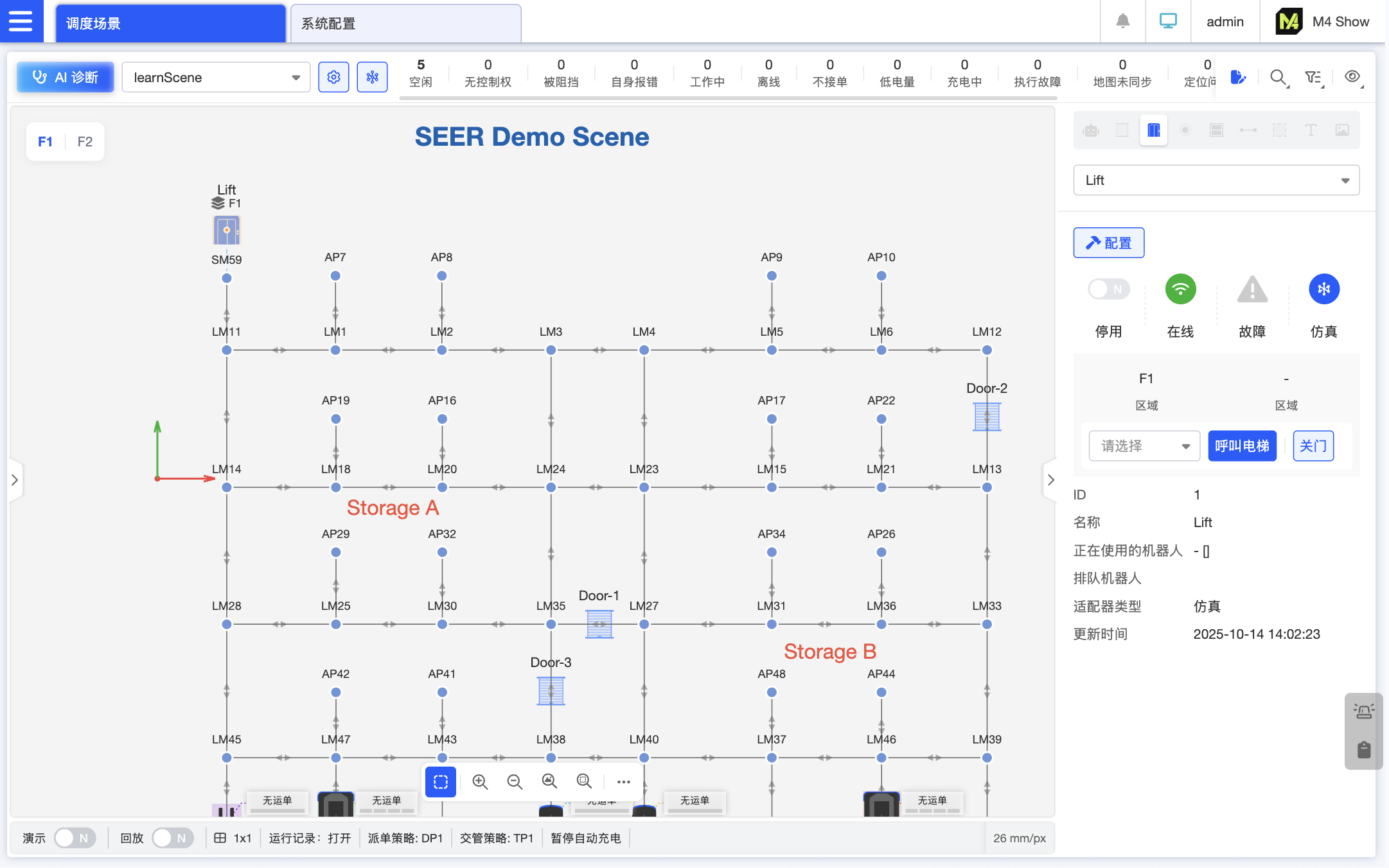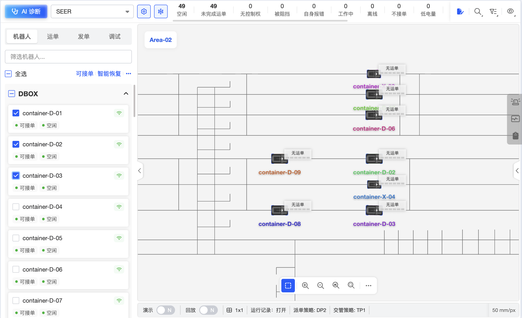 调度总体运行界面:顶部为场景切换下拉框和机器人、场景状态统计栏;左侧机器人卡片纵向排列,直观查看机器人关键信息;中间的地图区域显示场景整体的分布、机器人实时位置、任务执行路径及区域;底部状态栏呈现调度核心参数。全局掌握整体调度状态。