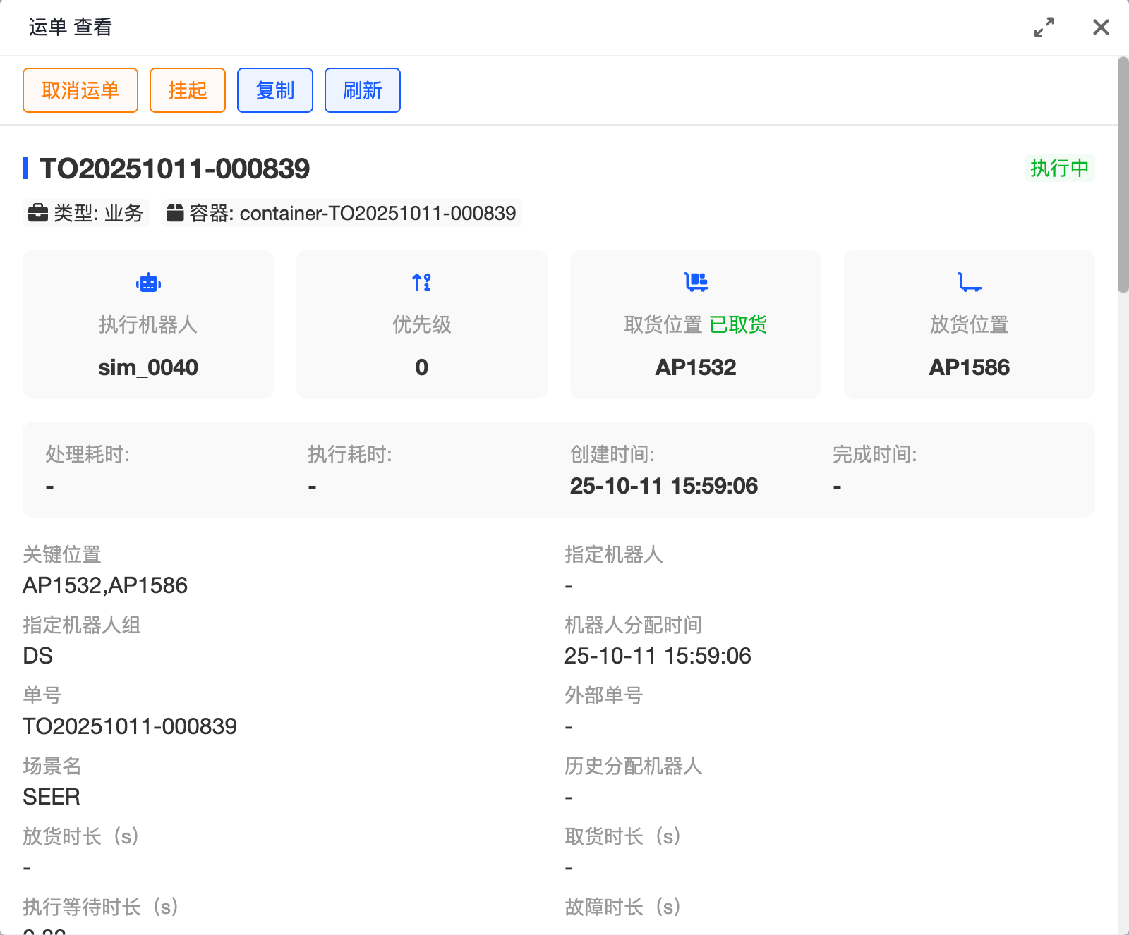 运单详情页面,完整展示运单全流程信息,包括运单号、当前状态、创建时间、运单类型、取放货位置等,帮你全面追溯运单执行过程,快速定位问题。点击顶部操作按钮可以取消、挂起、复制运单。