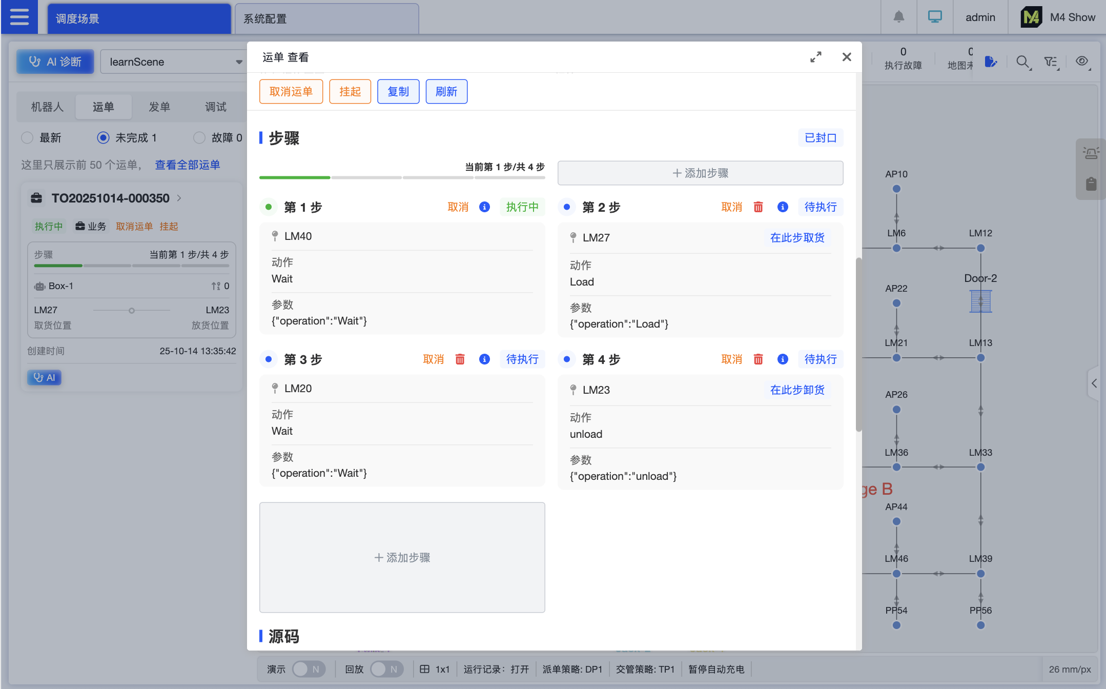 未完成的运单卡片列表:实时查看运单的执行状态、当前步骤、取放货目标位置和其他关键信息,无需点击进入详情,就能快速追踪待处理运单的核心情况,支持取消、挂起运单以及快速进入此运单的 AI 诊断。