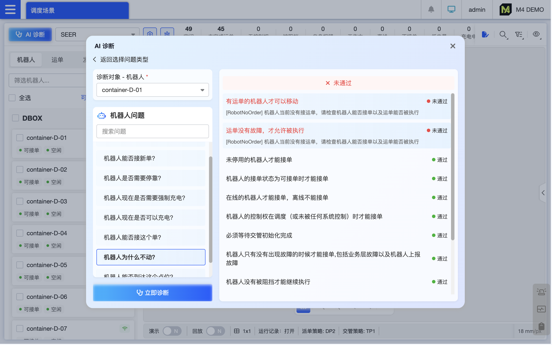 AI 诊断机器人问题,只需要选择诊断的机器人和诊断问题,系统自动检测针对该问题的关键条件,以 “通过 / 未通过” 直观展示结果,并标注不通过项的具体原因和修复指引。
