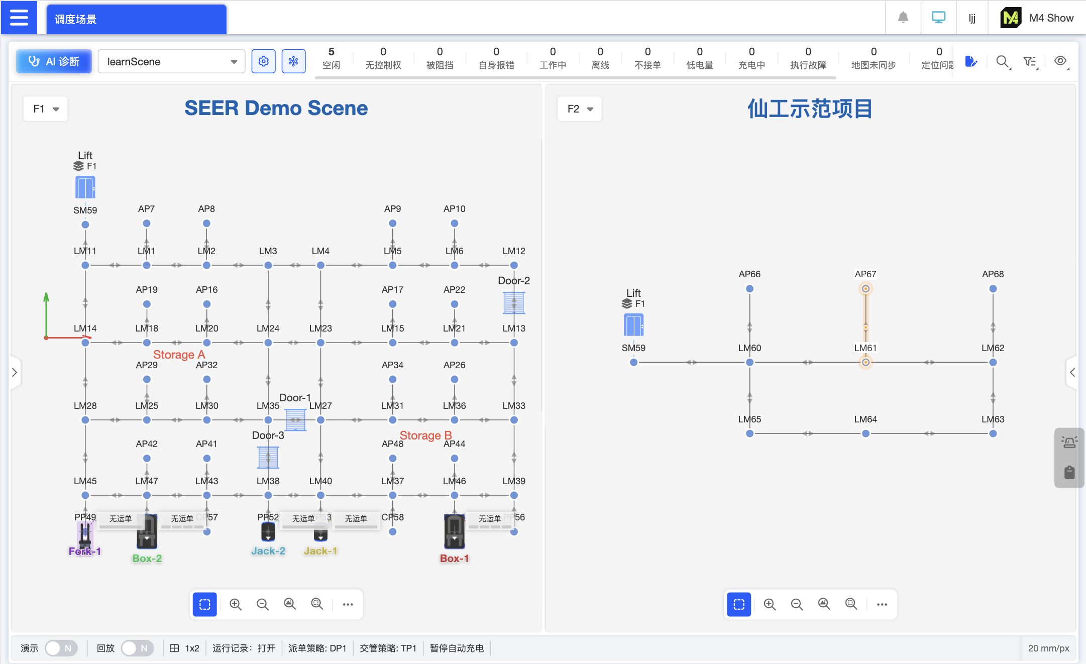 地图分屏,帮助分屏对照查看不同区域的执行情况,比如左边看一楼,右边看二楼,对比查看不同区域的机器人密度、运单进度及拥堵情况。