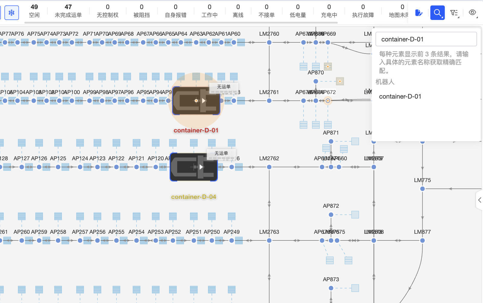 将调度总体运行界面的地图放大,可以看到更细节的机器人运输情况,每个机器人身上有箭头表示车头方向。机器人有空载和载货两种形态,当机器人取货结束,机器人身上将会显示货物标记,在图中表现为黄色的货物。机器人在执行运单过程中,机器人右上角的卡片上,会显示机器人当前正在执行的运单编号。