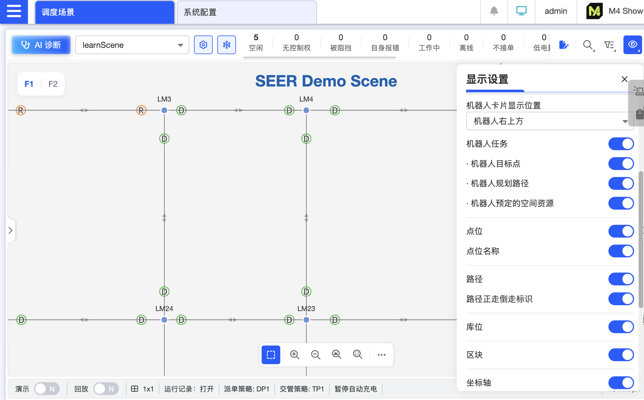 演示模式,方便在展会的场合,界面自动切换视角,查看每个机器人的运行情况。开启后,场景中定位到在动的机器人,放大,然后切换到另一个在动的机器人,以此类推。适合展会向客户直观展示系统整体运行效果。