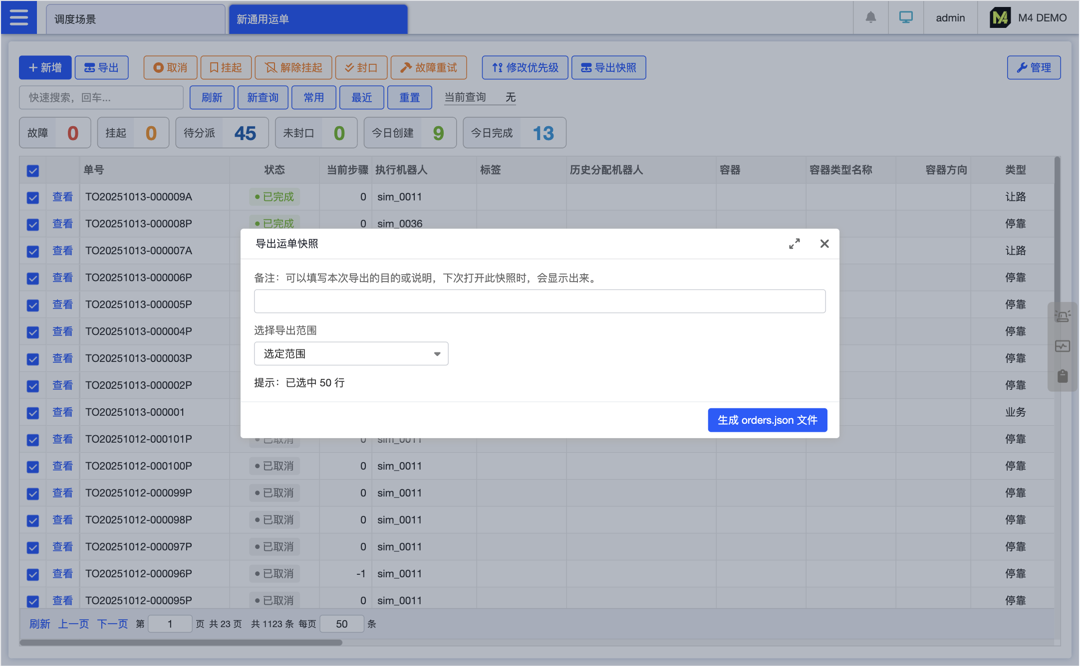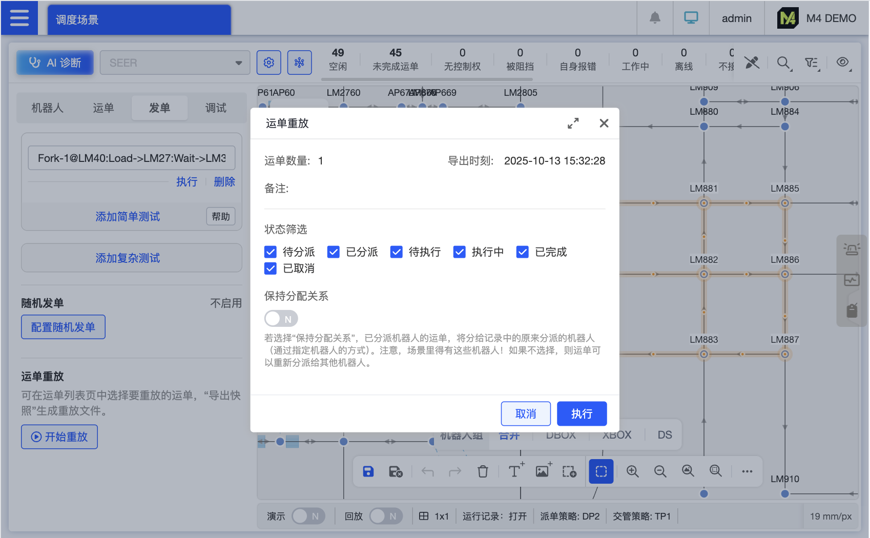 系统对运单快照文件进行解析,检测运单数量、导出时刻和备注,呈现在页面上,用户可以对运单状态进行筛选,还可以开启“保持分配关系”,开启后表示已分派机器人的运单,在重放时若有这些机器人,则会继续让他们执行对应运单。点击执行后,将生成新的运单,实现运单逻辑的复用,便于调试、验证运单执行效果。