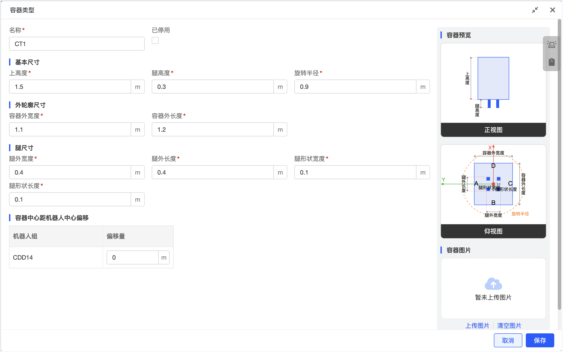 为场景添加容器类型,需要配置基本尺寸、外轮廓尺寸和腿尺寸,除这些基本参数外,如果容器不是放在机器人正中心的位置,那么还要配置偏移量。为了便于理解,配置值都包含默认值,且右侧的预览图会标识各个值的含义,图文对照,配置起来更容易。随着配置项的输入,右侧的容器预览将会实时变化。