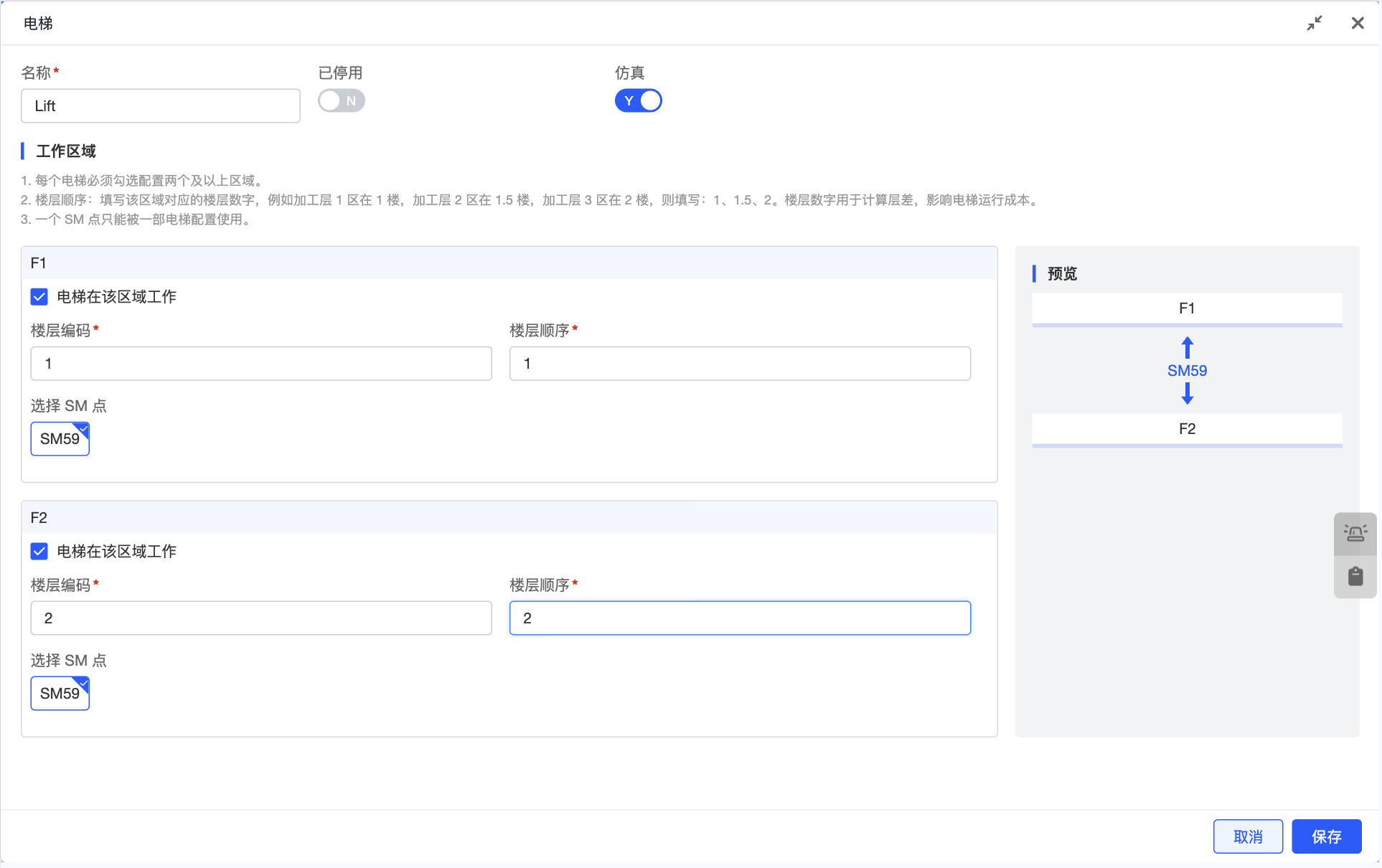 为场景配置电梯,勾选电梯所在的区域后,在区域内进行电梯的楼层编码和楼层顺序的配置,为其选择场景中的 SM 点,右侧的预览根据配置实时变化,模拟实际电梯的分布,更有立体感。