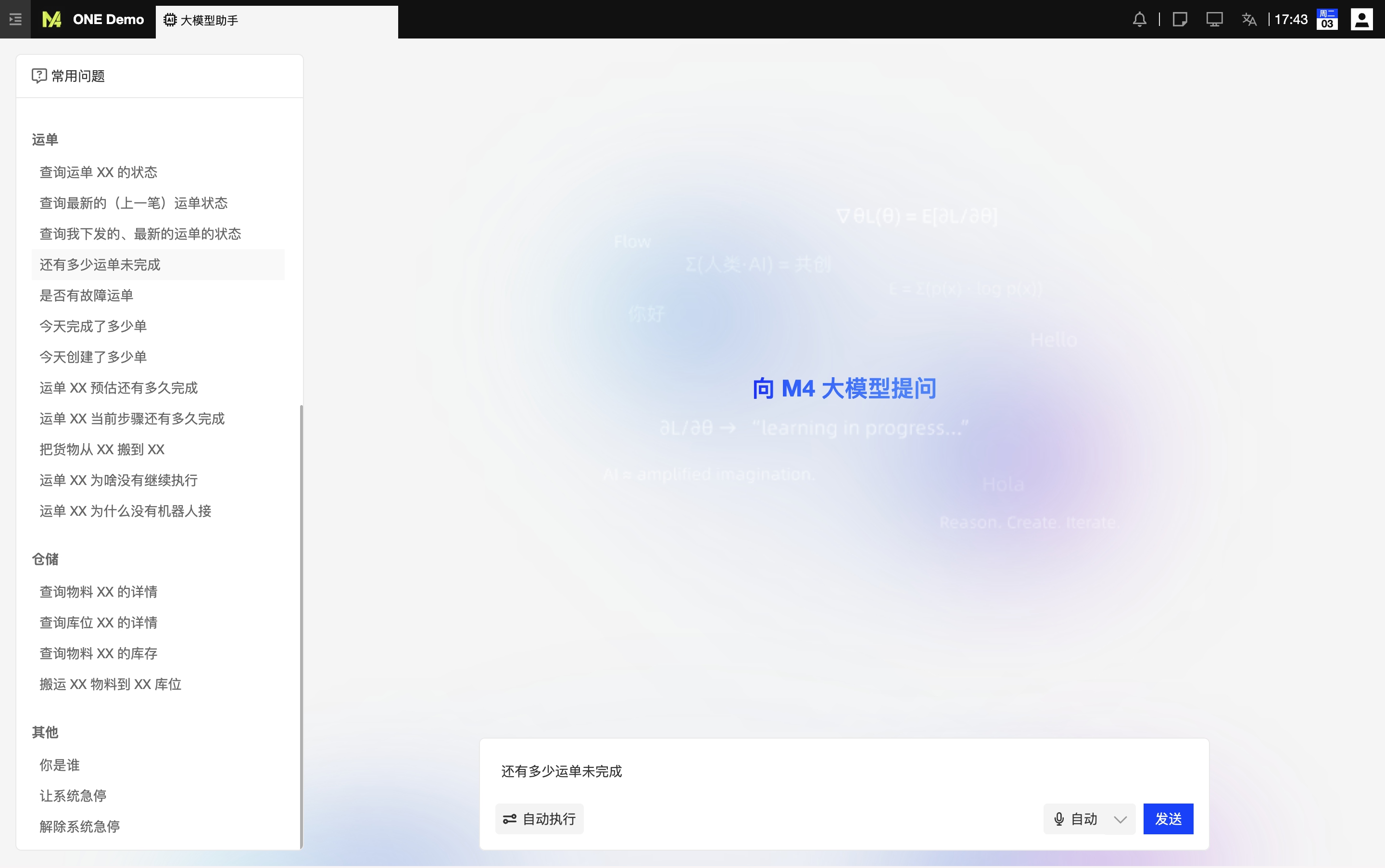 常用问题预设了工业场景中可能出现的高频问题,并按照机器人、运单、仓储等进行分类。用户选择列表的问题,对应指令便会自动填充至输入框。用户仅需修改指令中的关键参数(如机器人编号或点位名称)即可快速发起提问。这种“模板化输入”的设计大幅降低了交互门槛,实现了复杂调度指令的便捷下发。