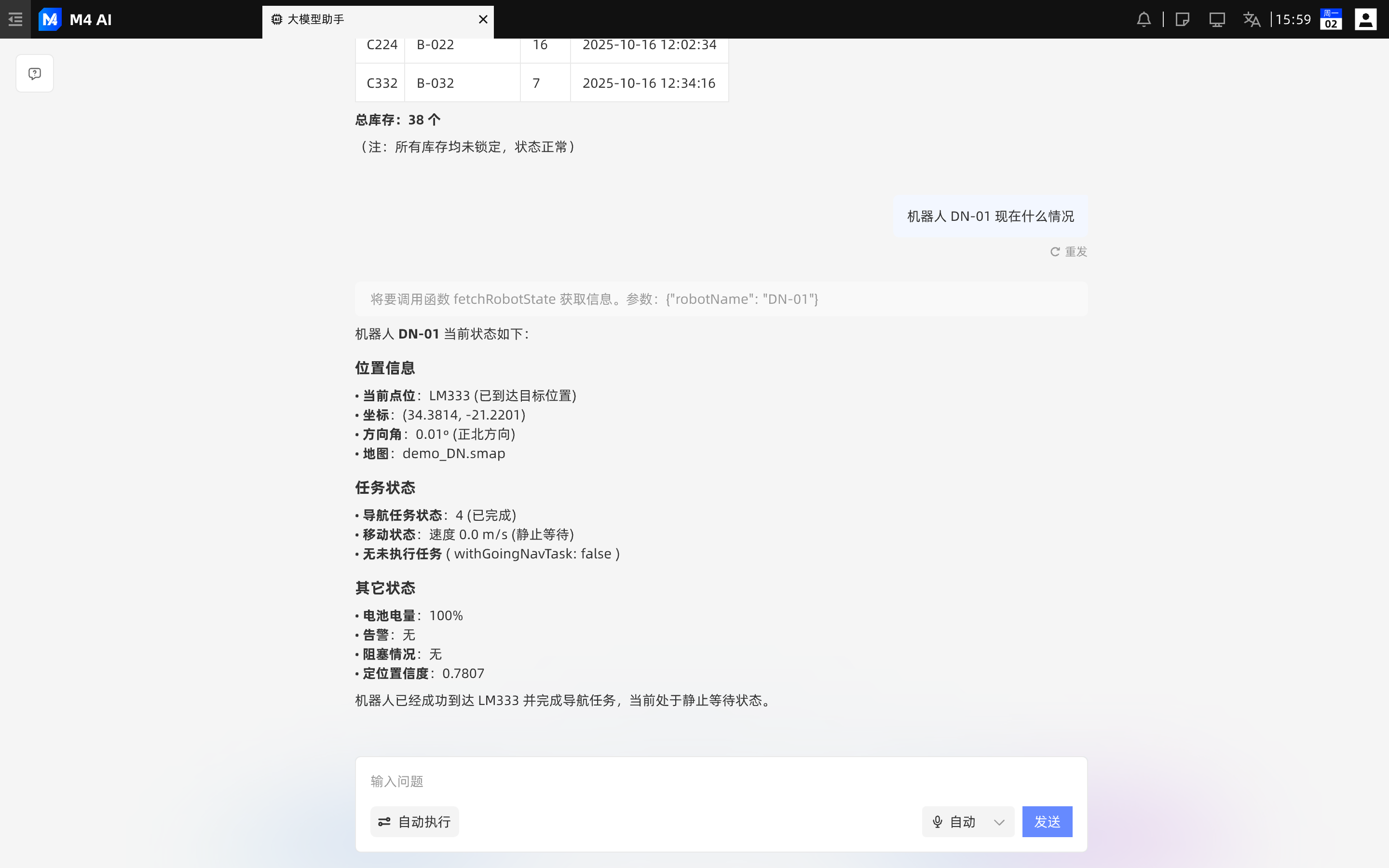 通过大模型的自然语言处理能力,用户可直接下达非结构化指令,查询机器人、运单、仓储等相关状态。系统在理解语义后,透明化展示底层函数调用过程,并将复杂的原始数据自动转化为表格、列表等易于阅读的格式,提升复杂信息的获取效率。