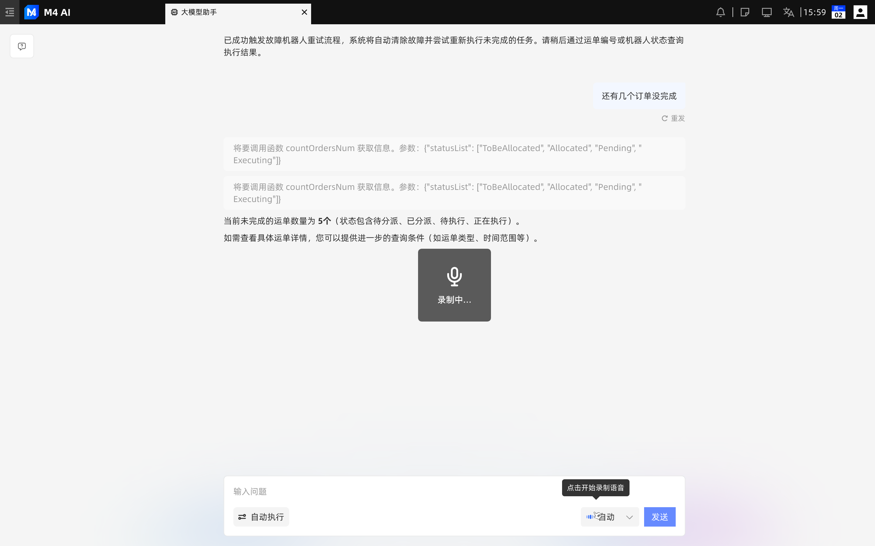 支持多模态输入,用户可通过语音指令与 M4 AI 助手进行自然语言沟通。语音识别功能提供了手动发送与自动发送两种模式:在“自动”模式下,系统将在语音识别完成后自动发出消息,大幅提升了工业移动场景下的操作效率。界面中心及底部输入框通过实时动效与文字提示反馈录音状态,确保交互过程的高响应性与透明度。
