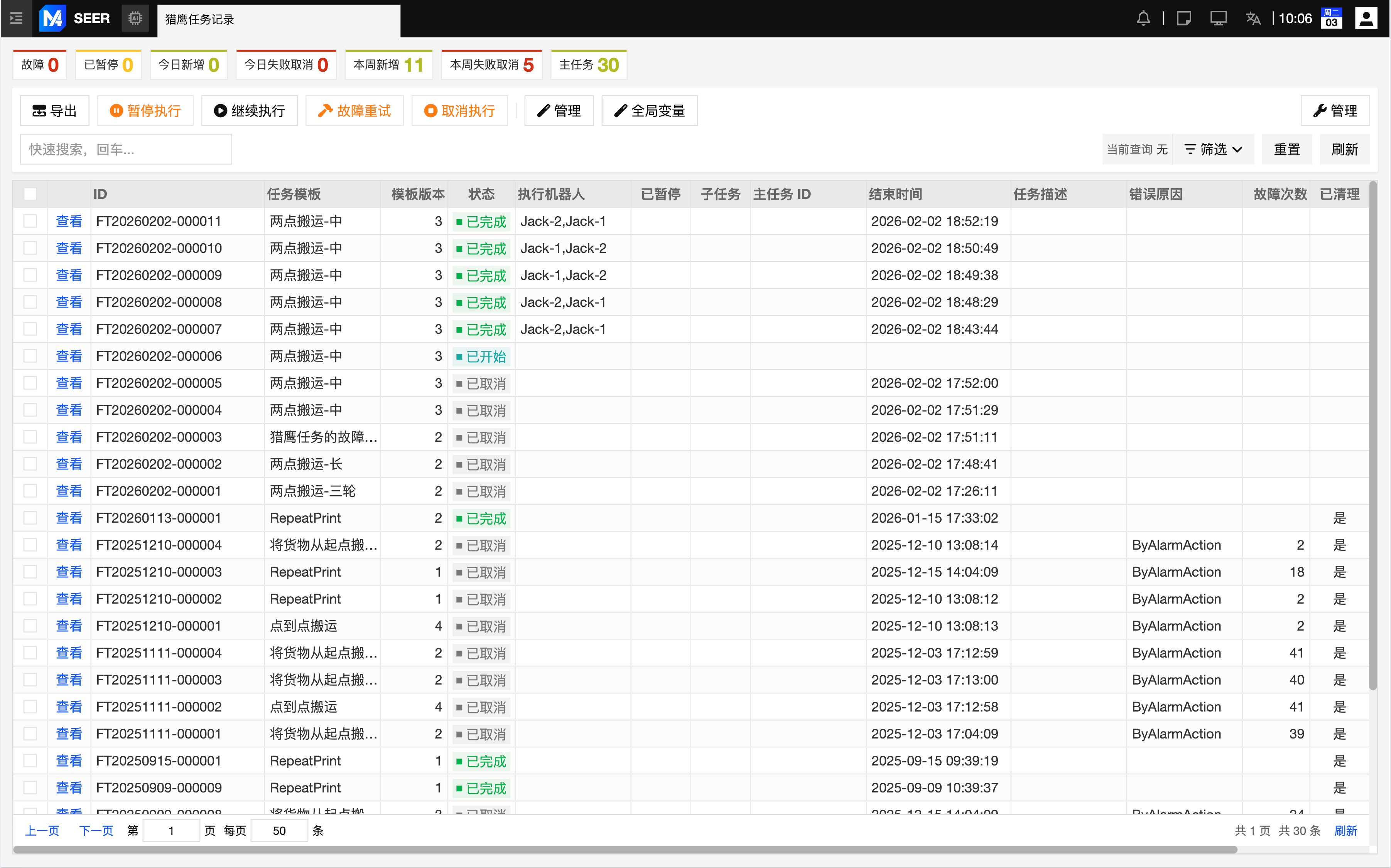 猎鹰任务记录界面:以表格形式展示并管理全部猎鹰任务。界面顶部提供任务状态汇总与快速筛选功能,支持对任务执行快捷操作,可一键跳转至模板管理与全局变量配置页面。