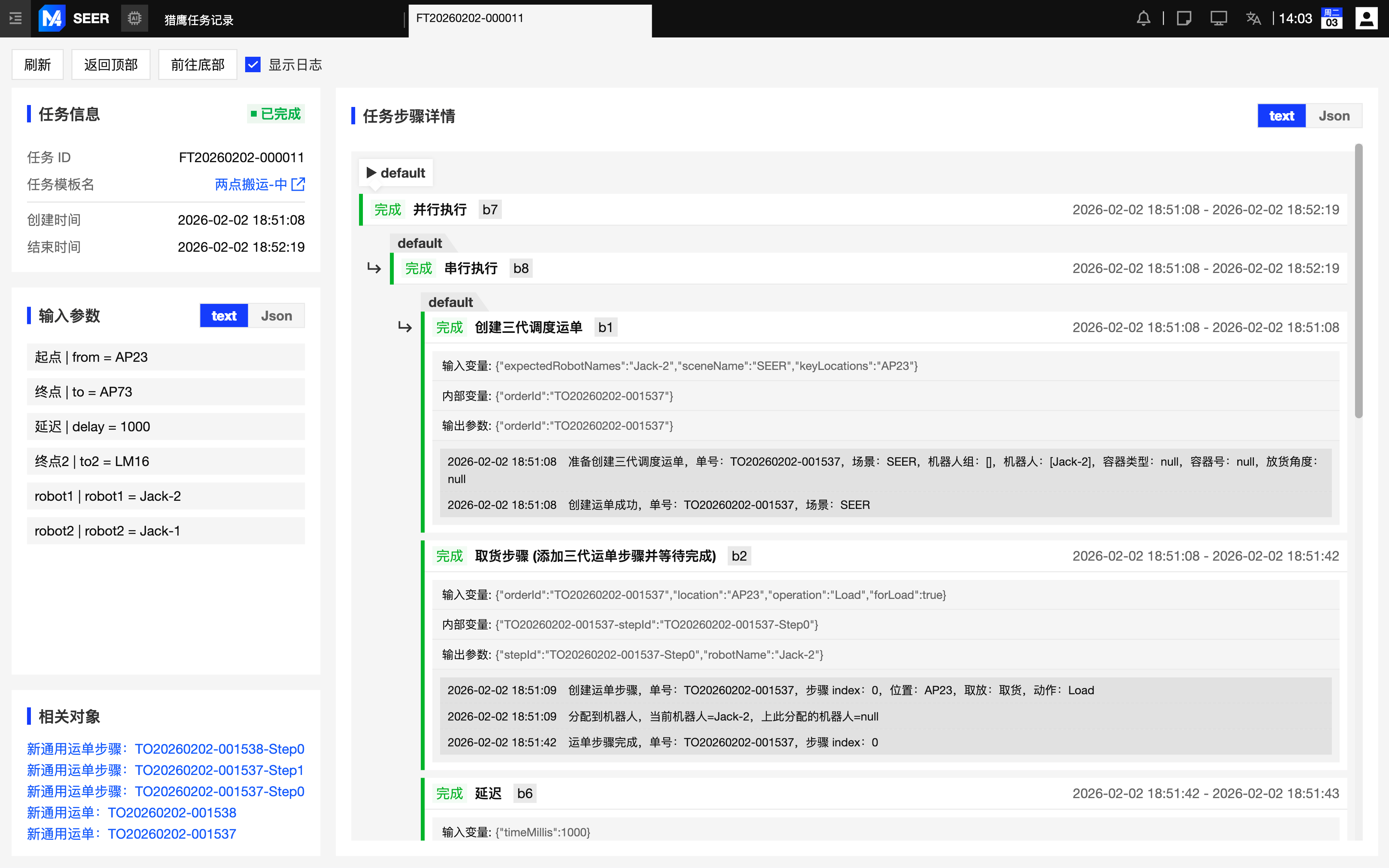 猎鹰任务详情界面:展示单个任务的完整详情信息,包括任务概览、输入参数、任务变量、关联对象及任务步骤明细。任务步骤支持查看完整日志,日志内容可在普通文本(Text)与 JSON 格式之间自由切换。