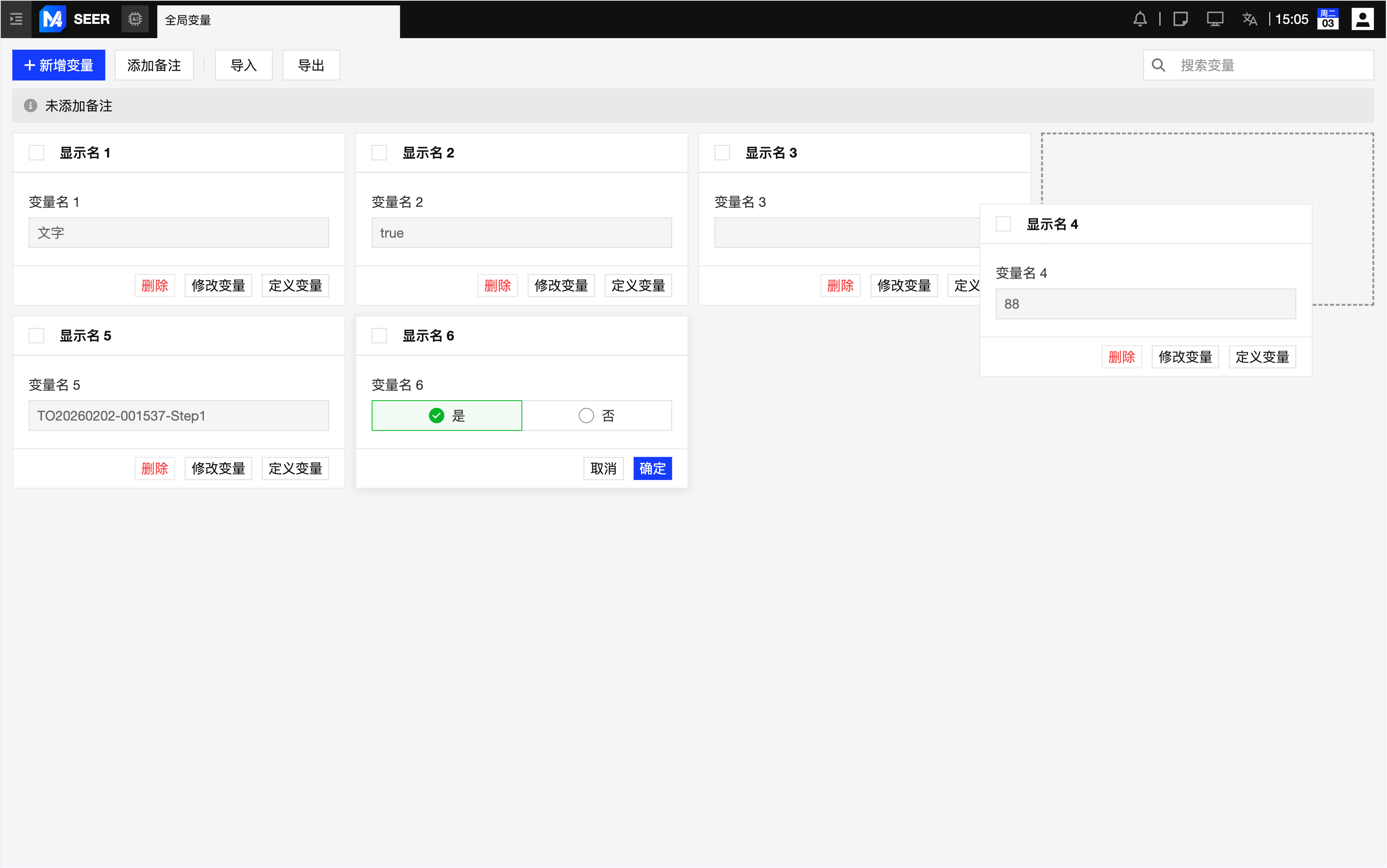 全局变量管理界面:以卡片形式展示系统全局变量,支持变量查看、值编辑、拖拽排序、导入导出与备注说明,区分管理权限与查看权限。