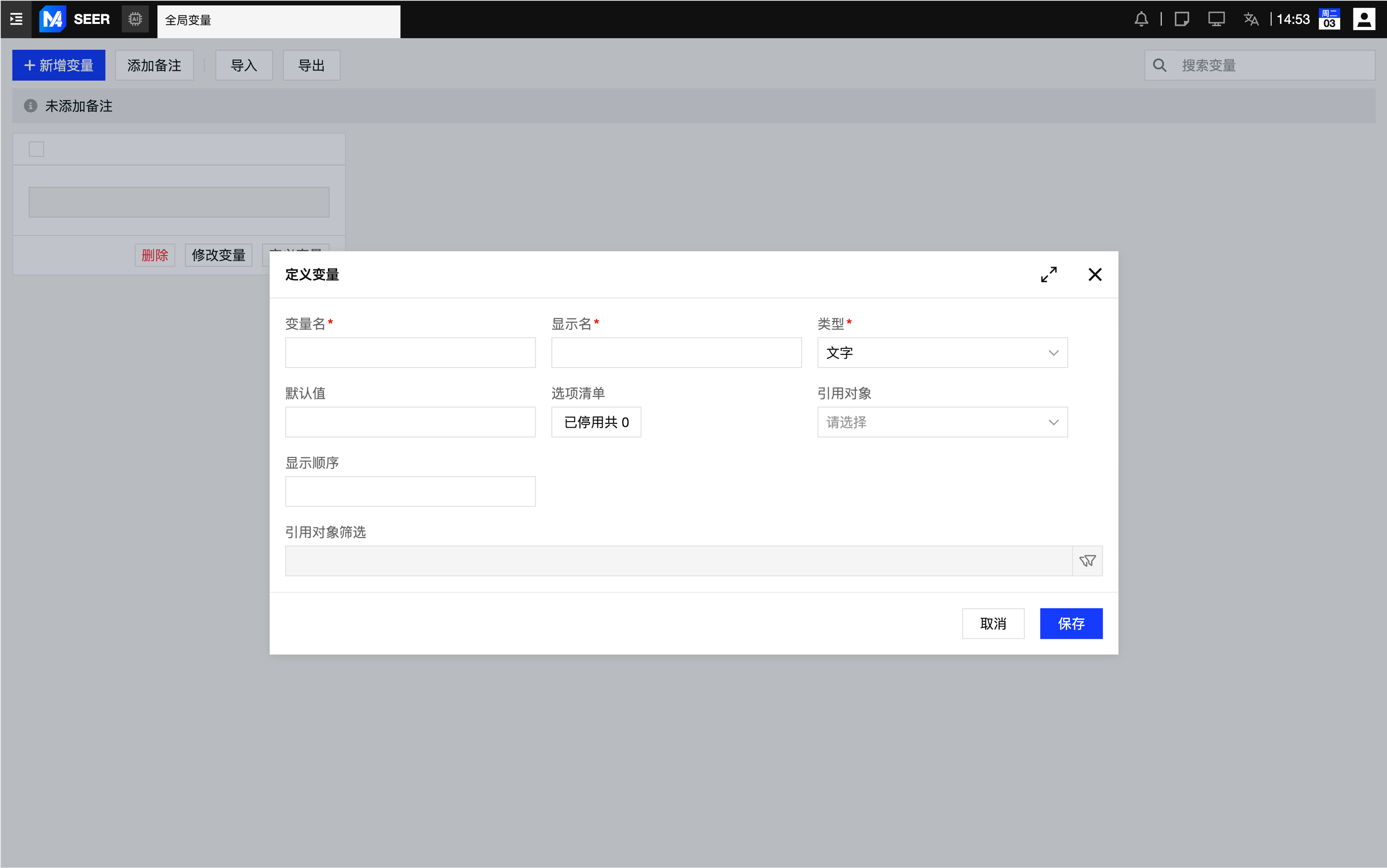 全局变量定义/编辑弹窗:用于新增或编辑全局变量,配置变量名、显示名、类型、默认值、选项清单与引用对象。