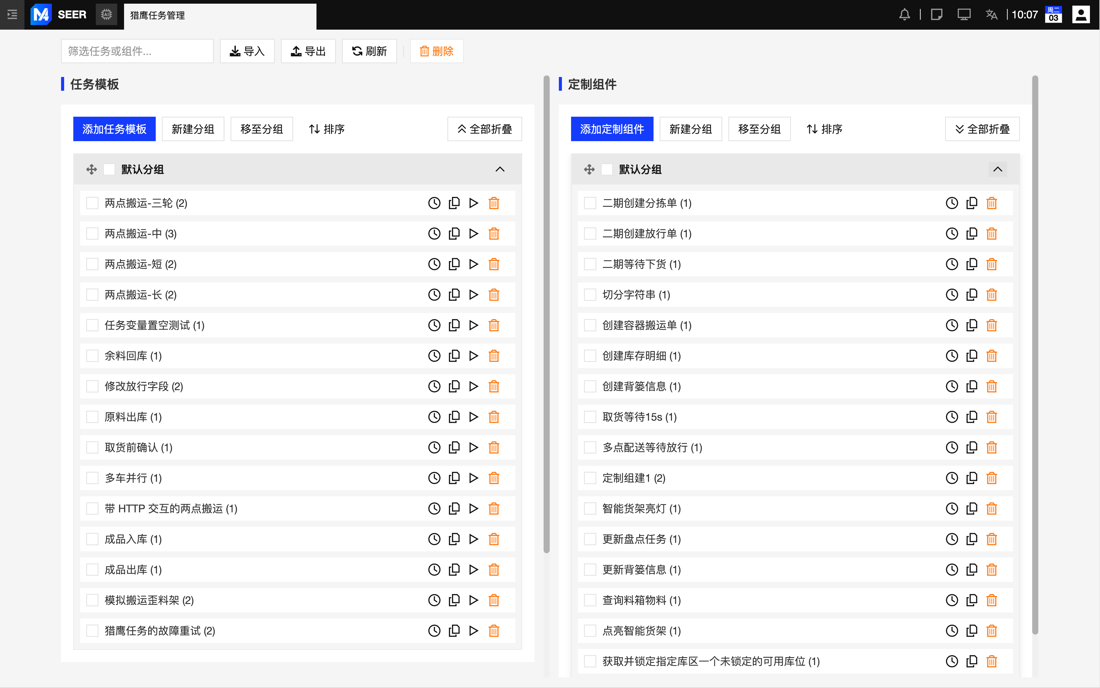 猎鹰任务模板管理界面:左侧为任务模板列表,支持可增删的默认模板分组、系统内建分组,同时支持自定义新增分组管理。右侧为定制组件区域,支持组件的新增、删除与分组归类。