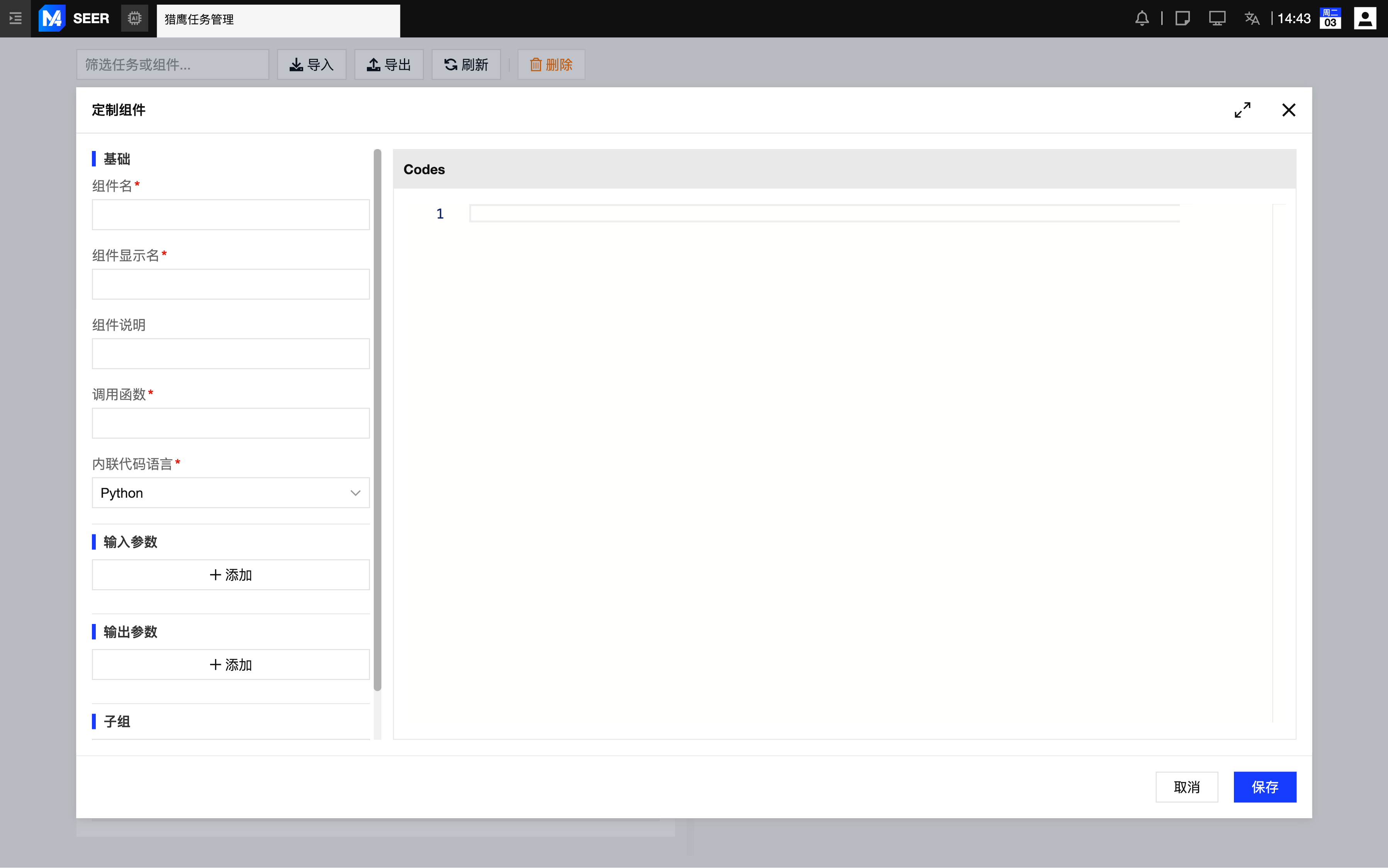定制组件新增/编辑界面:用于定制组件的参数配置、逻辑定义与属性编辑,支持保存、版本管理与源码查看。