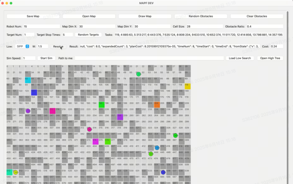 MAPF DEV 全面覆盖调度场景全流程核心需求,支持灵活调控地图尺寸、节点大小及障碍物比例,可通过随机生成或加载 / 保存功能快速搭建环境;同时能完成机器人生成、随机任务创建与智能求解,提供多种调度策略选择,并可实时查看求解仿真运行过程,深入底层与高层求解细节,助力用户清晰掌握调度逻辑与执行原理。