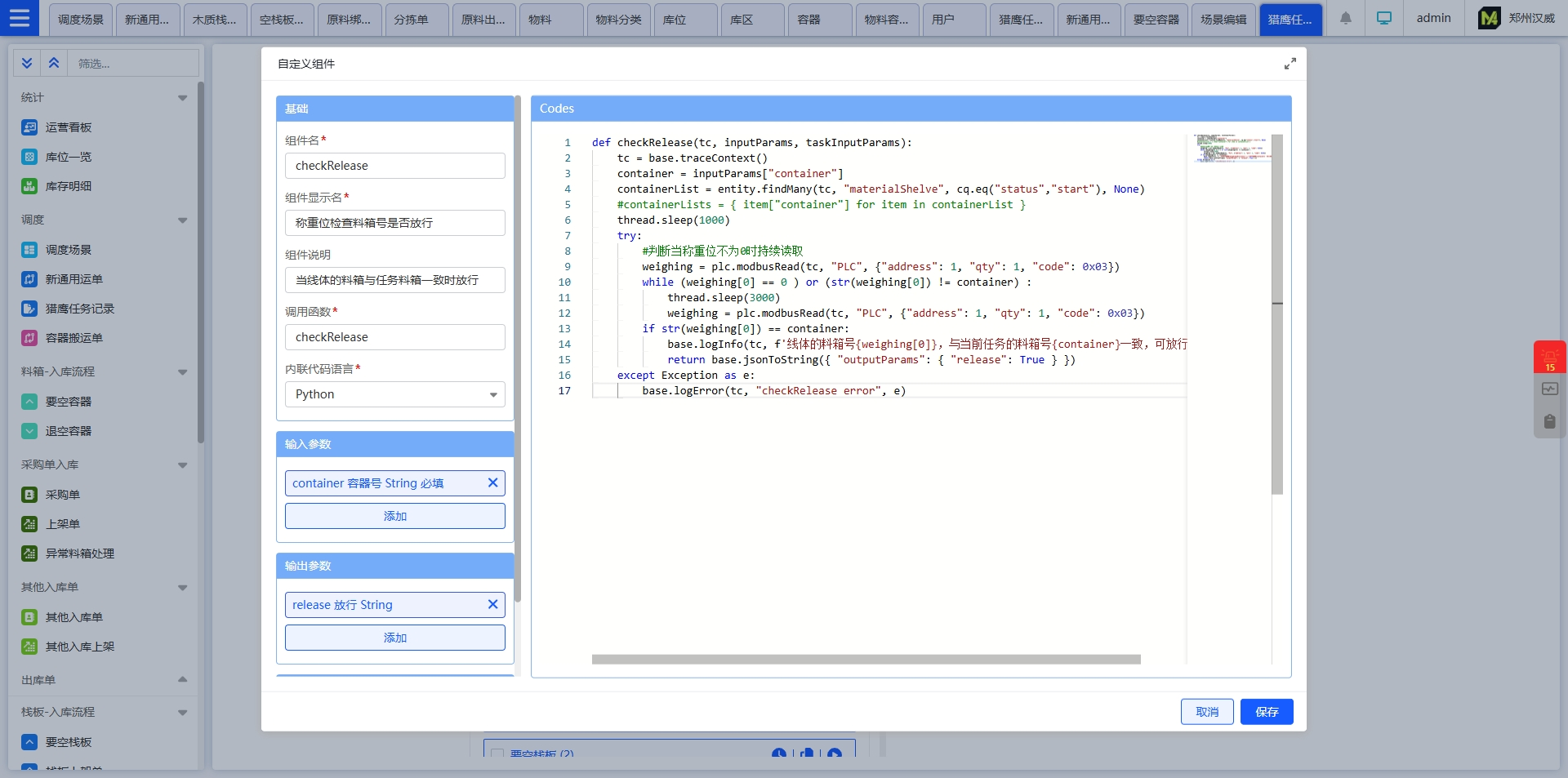 机器人调度只能实现相对标准的功能,如机器人管控、运单派发、路径规划和交通管制、门电梯等关键设备管控。但实际业务需求通常是非标的,特别是在工业场景下,每个场景的物流需求是高度差异化的。M4 猎鹰任务通过 Python 脚本扩展系统能力,与 M4 调度融合,可以可视化地编排业务流程,实现各类非标需求。例如,取货前与滚筒线等 PLC 交互,放货后告知某个第三方系统,根据设备是否繁忙选择不同终点,根据货物类型定制复杂的库位选择逻辑等。
