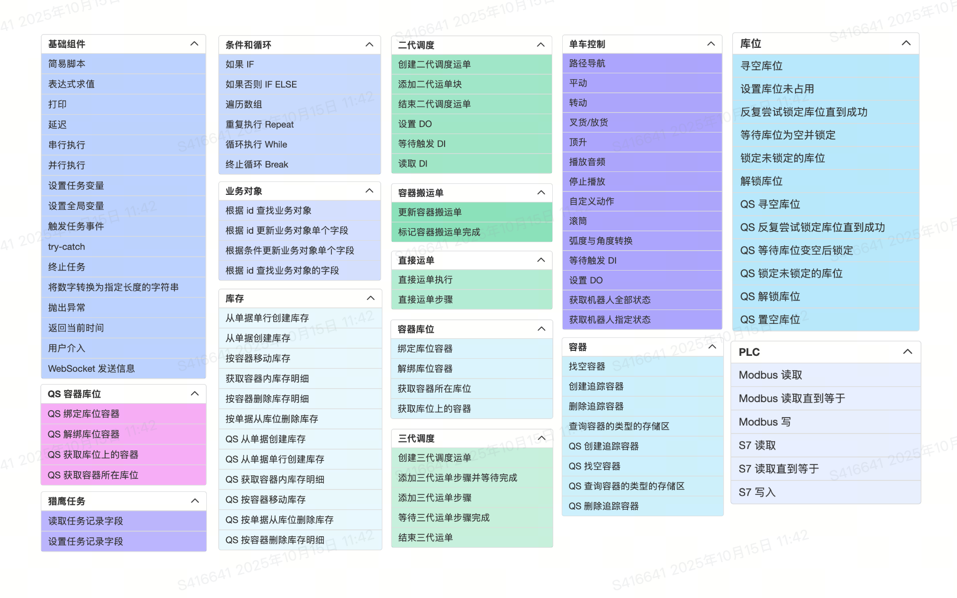猎鹰任务编辑页面内嵌组件覆盖广,除基础组件外,还包含调度、库存、容器、PLC、条件和循环等维度,如创建调度运单、按容器移动库存、Modbus 读取、重复执行 Repeat 等,支持用户各类复杂业务逻辑。